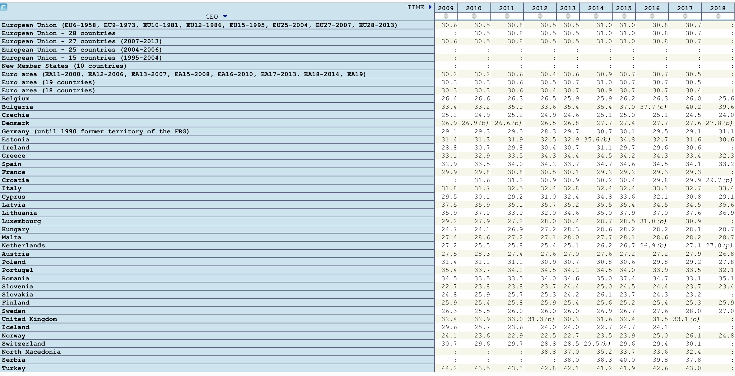 Żeby ocenić tą wartość trzeba odnieść się do innych krajów. Poniżej pokaże dane z Eurostatu. Pierwsze co wam się rzuci w oczy to różnica w danych dla Polski. I to też warto zaznaczyć i zauważyć. W danych tak podstawowych pojawiają się tak duże różnice w danych. Bierze się to stąd, że do Eurostatu raportował kto inny (GUS), nie Ministerstwo Finansów. Podobnie ma się sprawa zapewne w innych krajach.